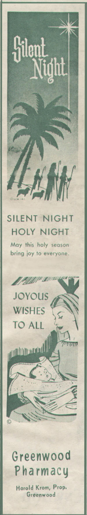 The Greenwood Pharmacy Greenwood, Clark, Wisconsin The advertisement to the left appeared in the 1967 Christmas Edition of the Greenwood Gleaner and was purchased when Harold Krom was the proprietor. Harold was a well known member of the community and an officer in the Masons. He married Virginia Abramson from Rice Lake, Wisconsin, June 23, 1953 in Minneapolis with Rabbi Nahum Schulman officiating. She was a graduate of Wis. State, Superior and Miss Wood's Training School. She taught kindergarten in the St. Paul Schools. Harold was the son of the Ben Kroms from Withee, WI. Harold operated the Withee Drug Store for about a year before purchasing the store in Greenwood.