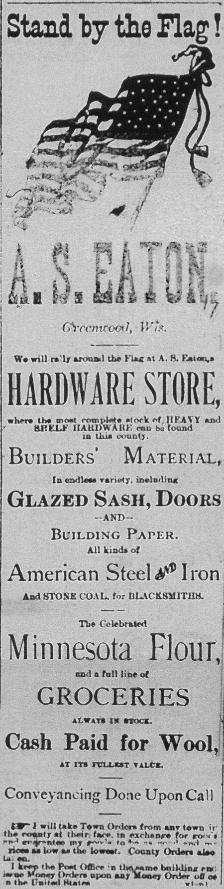 The Advertisement above appeared in "The Neillsville Times" during 1882 and featured the Hardware Store of A. S. Eaton in Greenwood, Wisconsin. The note near the bottom of the ad says, "I will take Town Orders from any town in the county at their face in exchange for goods and guarantee my prices to be as good and my prices as low as the lowest. County orders also taken. I keep the Post Office in the same building and issue Money Orders on any Money Order Office in the United States." |