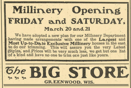 Miss Van Wold will arrive Monday direct from the millinery markets, where she has spent the past two months studying the new spring styles preparatory to resuming her duties as trimmer at the Big Store millinery department. Greenwood Gleaner, 14 Mar 1902.