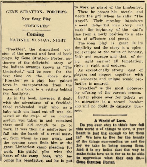 “The Broadway Amusement Co. will present Gene Stratton – Porter’s ‘Freckles’ at the Grand Opera House, July 31, 1917.”