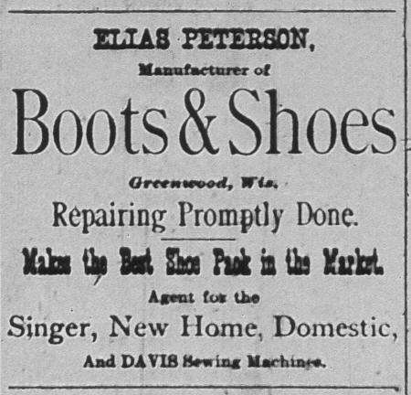 The Advertisement above appeared in "The Neillsville Times" during 1882 and featured the Elias Peterson General Merchandise which also sold Boots, Shoes and "Davis" Sewing Machines.