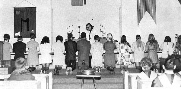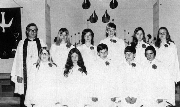 Centennial Confirmation Class of 1972 - Front row: Darla Jean B irkett, Patricia Ann Kind, Randall Jay Ystad, Arvin Wesley Verhuist, William Andrew Mason. Second Row: Rev. D. E. Wenger, Nancy Jo Klimpke, Donna Sue Klimpke, Bruce Lee Eskildsen, Cindy Jean Meyers, Carol Ann Adams. |