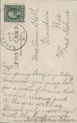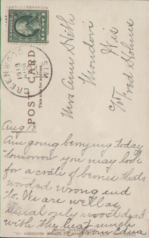 Steth, Mondovi, Wis. % Fred Holmes, postmarked 18 Aug, 1913,