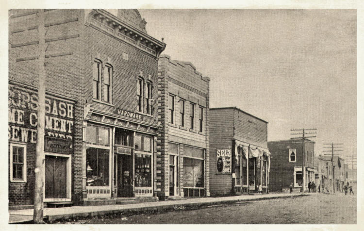 This 1913 post card of the west side Main St., Greenwood, Wisconsin shows some children playing on the north end of the street. The businesses from left to right are: the Sash, Cement & Sewer pipes, A. M. White Hardware, The F & M Bank, John Arend's Grocery and Volk Bros. Taylor Shop (later Jim's Dairy Bar).