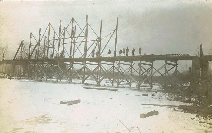 The bridge construction picture above is definitely the old black river bridge on county road "G". It was torn down when The bridge that exists now was built on the Same site. A temporary wooden bridge was Built about 75 yards upstream from it to be Used while the new one was being built. There were no other bridges in the greenwood area except the old railroad Bridge and the picture of the bridge being built definitely isn't a railroad bridge. Dick Warner.