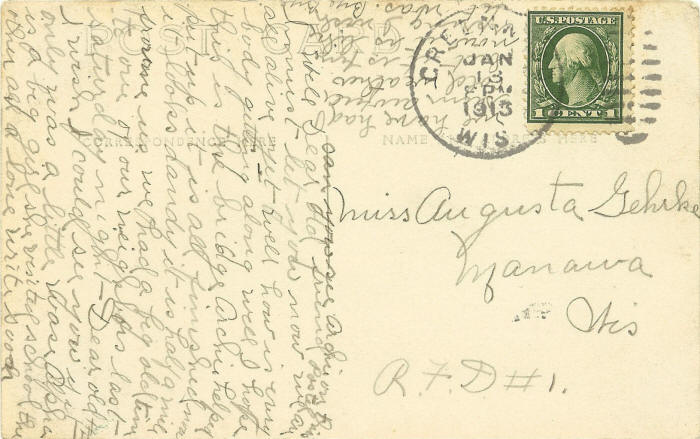 To: Miss Augusta Gehrke, Manawa, Wis. RFD #1, postmarked 13 Jan