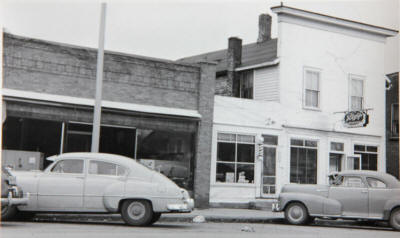 Laverne "Bud" W. Brown's Barber Shop is the narrow middle building between the variety store (originally constructed by August Noetzel) on the left and the bar on the far right which was owned by Ed Gregorich who sold it to his daughter Barbara and her husband Dennis Rasmussen.