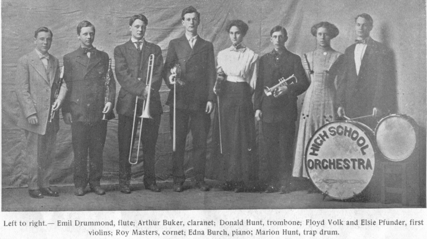 Band--Emil Drummond, flute; Arthur Buker, clarinet; Donald Hunt, trombone; Floyd Volk and Elsie Pfunder, first violins; Roy Masters, cornet; Edna Burch, piano; Marion Hunt, trap drum.