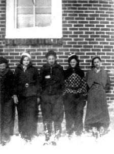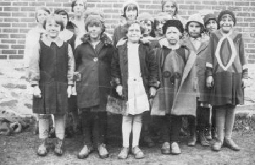 Pine Circle school, students are Evelyn Behnke, Alice Henning, Jane Adler, Elvira Lindow, Vivian Glenzer, Ella Stickert, Irene Gualke, Ellen Drescher, Helen Adler, Grace Stickert, Delores Adler, Martha Grottke, Edith Grottke, Helene Lindow, Verna Gualke. Date unknown, but must be early 1930s (definitely pre-1937).