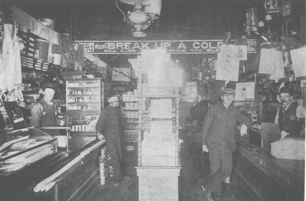 The clerk who helped Max, behind the counter at left, was Anton Hoganson, who was, later postmaster at Chili, now dead. Note that both Max and his clerk are in their shirt sleeves, and both wearing headgear, Max' hat being a low, flat derby.