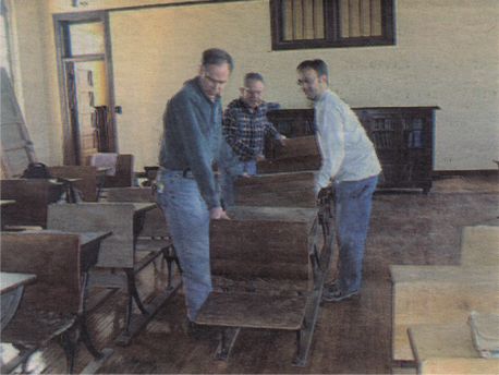 The Wisconsin Historical Society was out at the old Reed School in obvious force on Monday, getting ready for the fast-approaching June 10th dedication of the former one-room school house along U. S. Highway 10 east of Neillsville. Coming up from the Society offices in Wisconsin Dells to move some of the old, traditional row of desks into place are (from left to right) Greg Parkinson, deputy administrator of historical sites, Dale Williams, director of the Reed School site and Jeff Murray, curator of education. The 93-year-old school building is expected to be ready to “teach” once again before June 10th. The Wisconsin Historical Society will be opening its doors with special interpretive lessons for area 4th-graders starting on May 14th. Invitation to the