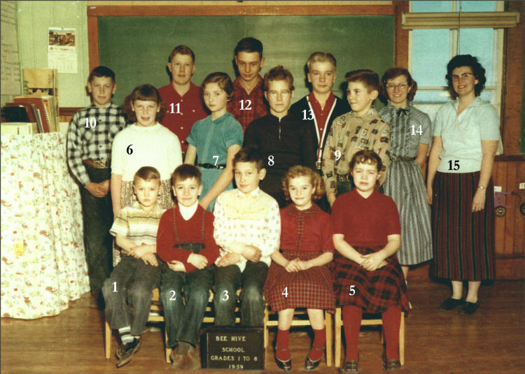 Bee Hive School Grades 1-8, 1959 1. Gary Lindgren 2. Kenneth Burtard 3. Victor Grube 4. Diane (Woik) Harington 5. Sheila Koplitz 6. Marcella (Grube) Sobeck 7. Alice Anderson 8. Dolly Voge 9. Delly Buss 10. Douglas Grube 11. Jerry Hill 12. Kenneth Grube 13. Glenn Lampi 14. Charlotte (Thess) Miller 15. Teacher, Mrs. Charlotte Devine. |