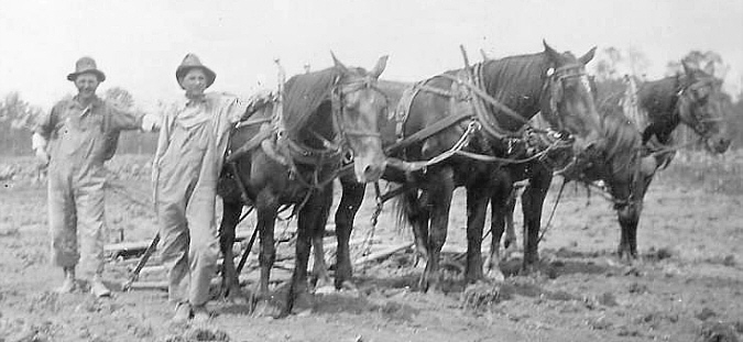 Charles & Ray Purgett--Circa 1920 The three horse hitches such as the one above were used often as the ground on the Withee, Wisconsin Farms tended to be either hilly or swampy. (Contributed by Diane Purgett, Neitzel, Kleinke) |