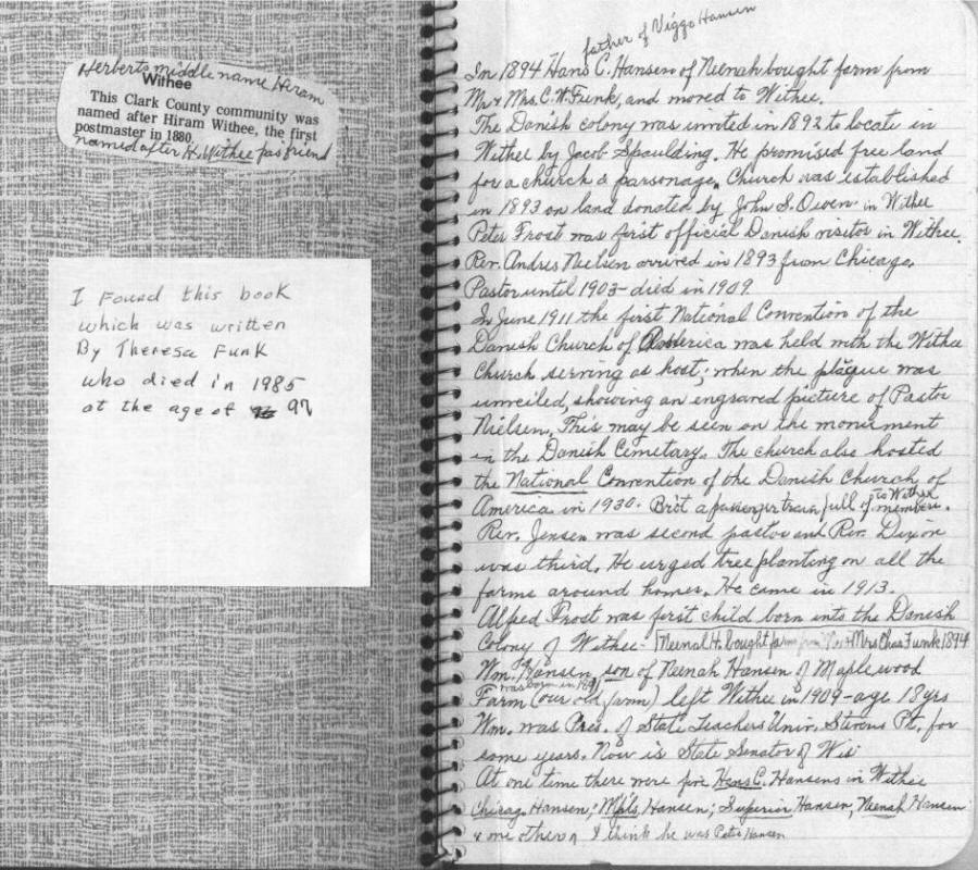 In 1894 Hans C Hansen of Neenah (father of Niggo Hansen) bought farm from Mr. & Mrs. C.W. Funk and moved to Withee. The Danish colony was invited in 1892 to locate in Withee by Jacob Spaulding. He promised free land for a church and parsonage. Church was established in 1893 on land donated by John S. Owen in Withee. Peter Frost was first official Danish visitor in Withee. Rev. Andres Nielsen arrived in 1893 from Chicago. (Pastor until 1903—died in 1909) In June 1911 the first National Convention of the Danish Church of America was held with the Withee Church serving as host; when the plaque was unveiled showing an engraved picture of Pastor Nielsen. This may be seen on the monument in the Danish Cemetery. The church also hosted the National Convention of the Danish Church of America in 1930. Br’ot a passenger train full of members to Withee. Rev. Jensen was second pastor and Rev. Dixon was third. He urged tree planting on all the farms around homes. He came in 1913. Alfred was first child born into the Danish Colony of Withee. Neenah H. bought farm from Mr. & Mrs. Chas Funk in 1894. Wm. Hansen (born in 1891) son of Neenah Hansen of Maplewood Farm (our old farm) left Withee in 1909—age 18 yrs. Wm. was Pres. of State Teachers Univ. Stevens Pt. for some years. Now is State Senator of Wis. At one time there were five Hans C. Hansens in Withee: Chicago Hansen; Mpls Hansen; Superior Hansen; Neenah Hansen and one other. (I think he was Peter Hansen)