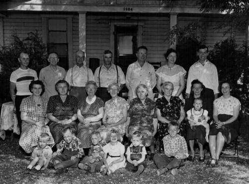 Back row: Clarence Goodel, Mr.Plummer, Alfred Decker, Otto Reineking, Hans Kolpanen, Alma Kolpanen, Leroy Decker