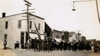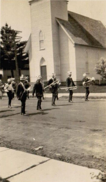 Photos of July 4th Celebration1924, written on back ; picture on left taken with Zion E & R Church in background.  Top right picture needs to be identified for location in Greenwood, Contact us.  Bottom right is parade with main street buildings in background, Volk Bros Tailor’s building, first one on the left.  Note in these pictures sidewalks were in place, but streets were not paved.