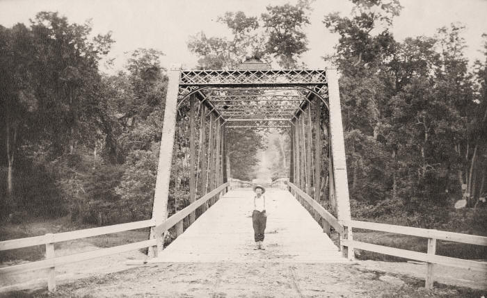 #121 Submitted by Terry Larsen This bridge photo has a back stamp of photographer, J. E. Gearing, Loyal WI. The nameplate on the bridge reads "1887 King Iron Bridge Co. Cleveland O". It is a single span wagon bridge over a creek possibly near Loyal or Greenwood. Assuming it was taken soon after construction, J. E. Gearing would have been operating in 1887-1888. |
