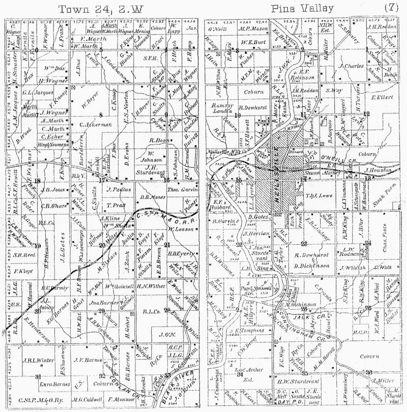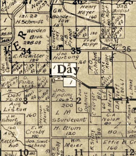 **Note: Our County Historian, Steve Roberts, places the Community center of Day in Pine Valley Township, The actual location is easily viewed on this more detailed 1893 Map of Pine Valley Twp. Day is located at the very bottom of the map directly down from Neillsville. |
