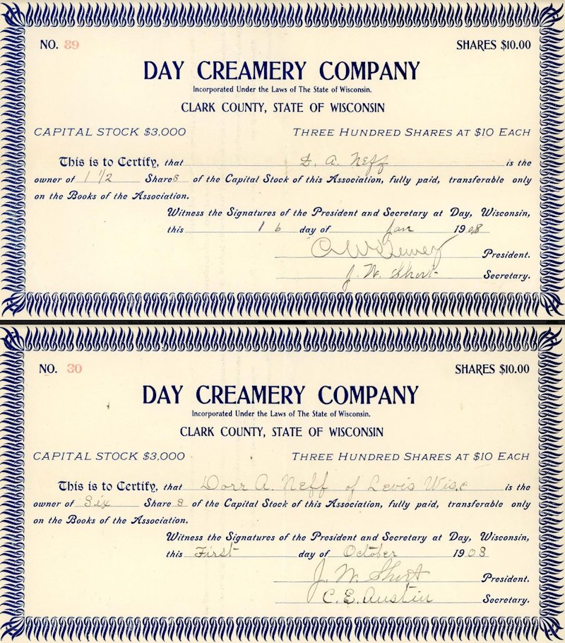 The surviving two Day Creamery ledgers with July 1903-January 1906 payment records (with many pages missing) and stock issuance indicate that there was a reorganization of the Day Creamery Company in 1902 with new stock issued beginning in 1903. The following were paid for “old stock” in July 1903: R. W. Canfield, one share $5.00; Mrs. H. Halvorson one share $5.00. In January 1904: R. F. Goss, one share $5.00; February 1904 H. Westby one share $5.00; November 1904 A. Lauber one share $5.00. 1903 dividends to the new shareholders were paid in January 1904 at the rate of $1.50 per share. Payment and stock records indicate that fractional share “dividends” were issued to the stockholders in lieu of cash for 1904-1913.