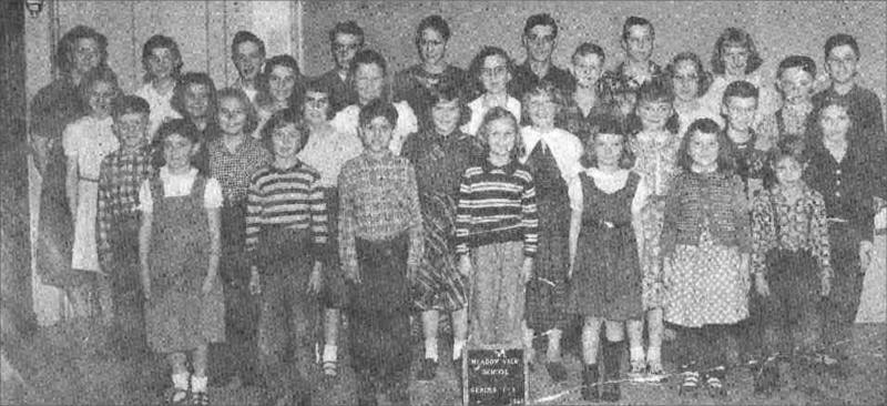 Top row, left to right: Mrs. Dale (Genevieve Thuber) West (teacher), Connie West, Kenneth Mitchell, Steve Mitchell, Mary Davis, Bruce Bryan, Eugene Bryan, Alice Struensee, Thomas Gentemann
