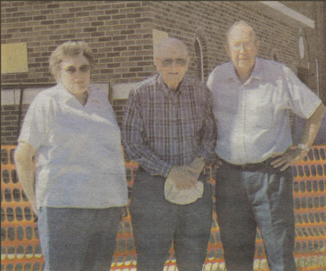 Standing in front of the corner of the new St. Anthony addition where the new time capsule will be placed are building committee members Carol Hubing (left) and James Helm (right), along with history buff Paul Glaudeman, who all worked with the found capsule contents.