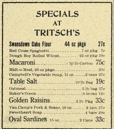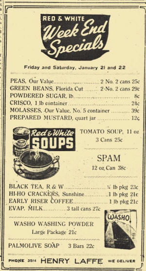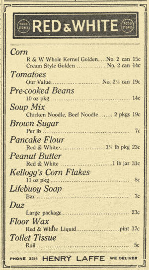 The "Red & White Food Store" was owned by Henry E. Laffe, the son of George and Lizzie (Eisenhart), early settlers in the Humbird area. Customers could call in their orders for home delivery. Red & White, like IGA, was a franchise/co-op chain which dated back to the early 1920s. The stores were independently-owned member stores throughout the USA which joined in an attempt to compete with prices offered at traditional chains like Safeway and A&P. As you can see from the advertisements above, they offered their own store labels as well as name brands and carried a wide range of items. Eventually, its stores were more likely to be found in small towns, such as this one in Humbird, Wisconsin. Quite often, they were often the only supermarket in the vicinity. |
