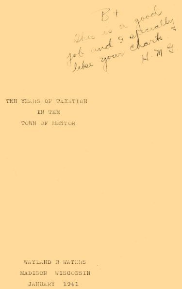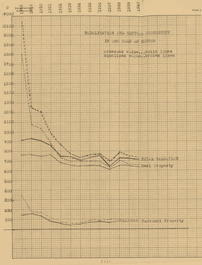 Graph # I in the appendix shows the profiles of the several assessment categories for the past decade in the Town of Mentor. The average downward tendency of valuation is quite apparent in all classifications, as well as the precipitous decline of aggregate or total valuation. The farming and country land, (shown in red on the graph), seems to be the most stable. The agricultural land is the biggest class, and is least subject to fluctuation. The cut-over country and the small residue of timberland have been too swampy and inaccessible to be worth much to begin with, and so had little value to lose. It is mostly contiguous with the Clark County Forest Crop Land, which has comprised much of the two easternmost and the northernmost ranges of sections, since its introduction under the present administration. The Town receives an annual income from the state for the Forest Crop Land. (cf. item June 19, 1939, treasurer’s account of receipts in the report of the Town Board of Audit, in the appendix); The Residential, Mercantile and Manufacturing property, (shown in blue), comprises but a minor part of the assessment, for Mentor is a rural, farming town. Personal Property, (shown in yellow), is also only of a minor status, being valued even under the cut-over and marsh land in the years of most extreme depression.