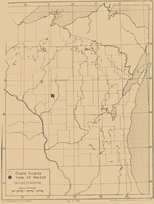 The Town of Mentor is one of the thirty-four in Clark County, the eighth largest County in Wisconsin. It is located in the West-central part of the state, on gently rolling land, is drained by the Chippewa and Wisconsin River systems, and it still has vestiges of its primeval timberland, with medium-sized pine and hardwood on the many ridges which are to be found where the border of the driftless area extends athwart the South-western townships. It was the timber which brought the first permanent settlements to this territory.