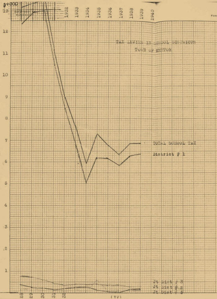Their comparative tax levies payable to the Town of Mentor are diagramed on graph # IV. The amounts from Numbers 2, 3, and 5 are inconsiderable in comparison with that from Number 1, as is indicated by the latter’s approximation of the total.