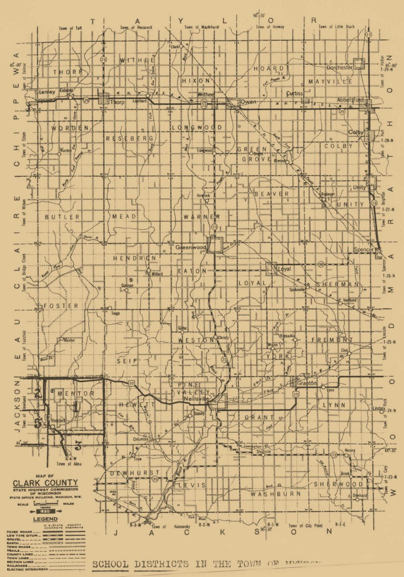 In that year, while Wisconsin was yet a territory, most of Clark County was surveyed, from the Fourth Principle Meridian, which extends through Clark County. Mentor Township, Number 24, Range 4 West, was surveyed in 1853 by Edgar Sears, and in that year Clark County was organized. Settlements were soon increased.