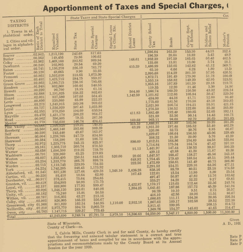 The Assessor for the Town of Mentor for the past six years has been William Aebersold, a local farmer and stock dealer. He is a native of Mentor, and is thoroughly acquainted with all land and other real property in the town. His appraisals are rated as excellent by the supervisor of Assessments. He finishes his assessment in forty to fifty days, is employed and paid by the day, and receives from $160.00 to $190.00 for his work. He is supervised from the District Headquarters at Sparta, which has twenty other Western Wisconsin counties, and he attends the Spring Assessors Meeting each year. It last met on April 6, 1940, in Clark County.