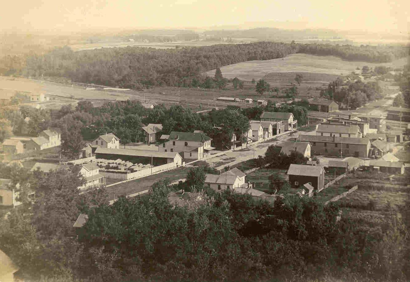 View of Humbird, Clark County, WI taken from the Bluff behind the school house. It appears to be a very early photo because State Highway 12 is there yet. The road that is across the railroad tracks in County Road F. Contributed by Don and Mae Zimmerman |