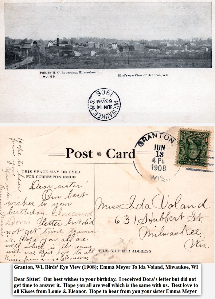 Granton, WI, Birds' Eye View (1908); Emma Meyer To Ida Voland, Milwaukee, WI