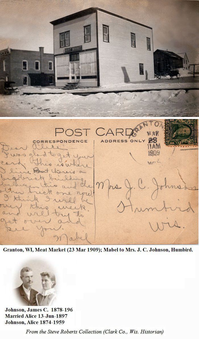 Granton, WI, Meat Market (23 Mar 1909); Mabel to Mrs. J. C. Johnson, Humbird. Biography of James "Cole" & Alice Johnson