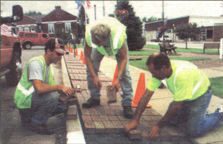 Last Wednesday, Tom Greene (right), Neillsville Parks director, was laying down the last of the engraved Hewett Street bricks along the walkway at Town Square Park. Matt Thomas (left) and Tim Nielsen of the Parks Department work crew assisted him. |
