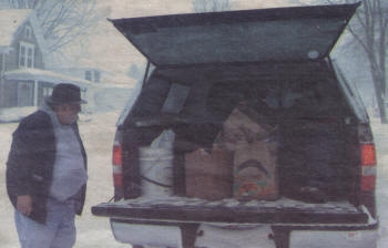 The snowstorm of the past weekend didn’t keep Christmas Angel Project deliverers from their appointed rounds. Jim Filitz (above) and Rev. James Mohr of the United Church of Christ were a delivery team. Filitz drove his four-wheel drive vehicle and Rev. Mohr helped with directions and carrying. (Contributed photo)