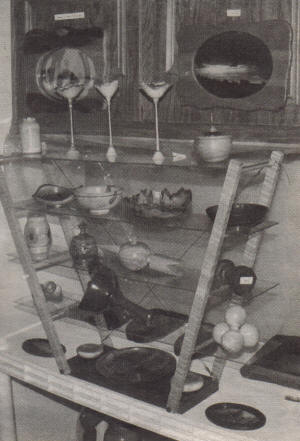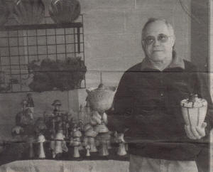 Wendell Ziegler of rural Neillsville holds a decorative centerpiece (left) made of Big Leaf Maple and a decoration (right) made of many types of wood, including maple, walnut and ebony. Ziegler displayed and sold many of his wood creations, including his best-selling wood mushrooms (shown at left) and many other items during the first ever Clark county Economic Development Corporation (CCEDC) and Tourism Bureau Studio Art Tour, held Saturday, April 30, and Sunday, May 1, at area artists’ home. The photo below shows more of his artistic work. (Photos by Peter Spicer/Clark County Press)