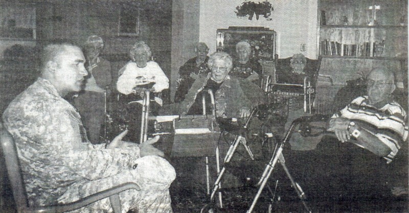 While home on leave for two weeks from Iraq, Staff Sgt. Edmond Schmid paid a visit to the Neillsville Retirement Community. The residents asked him many questions about his tour in Iraq. One question was “What was one of your most heartfelt moments while in Iraq?” Schmid answered, “When the soldiers handed out pencils and paper to all the school children, one little girl held up both of her thumbs with a great big smile on her face looking at the American soldiers as if to say ‘thank you.’”