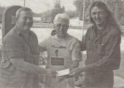 Kirk Rodman (center) of The Highground, Neillsville, received a $1,077 check Aug. 4 donated by the Central Wisconsin Truckers (CWT) Picnic. CWT members Tim Swiggum (l) and Erwin Page made the presentation. The annual event held in Owen pays homage to veterans and was held this year July 24-25. (Courtesy of Nathan J. LePage/ O-W Enterprise)