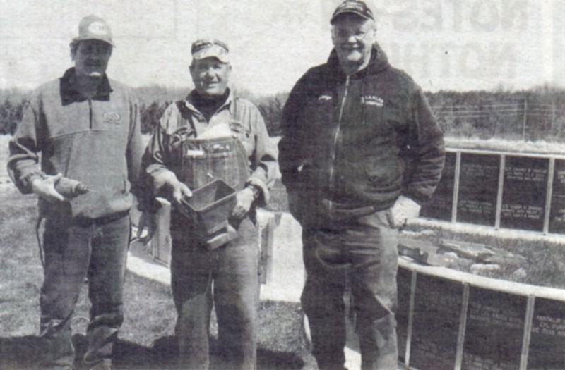 Work is under way to expand the Korean War tribute wall and surrounding area by volunteers (l-r) Rick Wenzel of Stratford, Billy DeBock of Kenosha and George Schmidt of Stratford. (Photo by Linda Cottrell-Sanders/ Clark County Press)