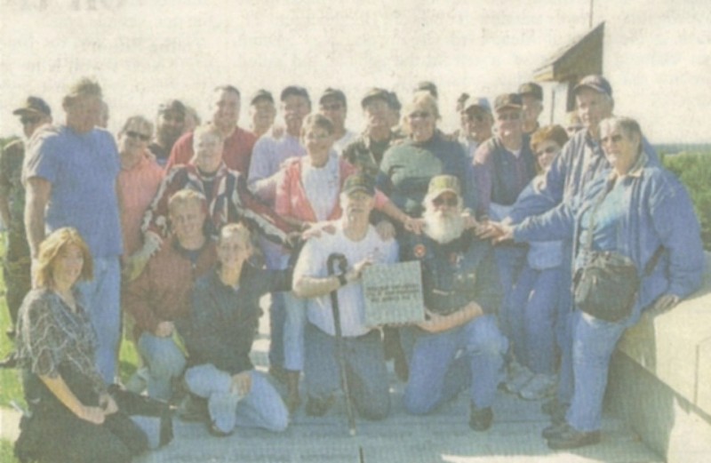 Military veterans Bill Weirich (kneeling, L) and John Broderick (kneeling, R) pose with family and friends, while being honored with a Legacy Stone Saturday, Aug. 22, at the Highground. Fifteen stones were placed. Lake Chapter Post 256 attended the Legacy Stone ceremony along with a color guard, firing squad and taps player. Broderick read the names of state residents killed in Iraq and Afghanistan. (Contributed photo)