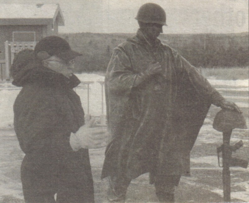 Those in attendance recited the Pledge of Allegiance to begin the event on a cold Friday afternoon. The Highground Volunteer General Manager Kirk Rodman discussed the GI statue, which wears a World War II helmet.
