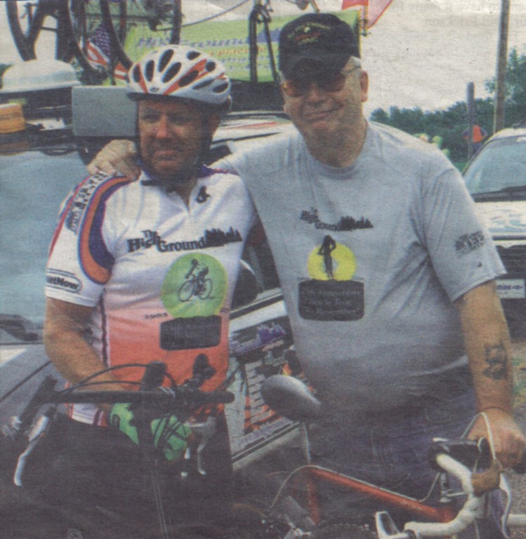 Tom Kingsbury (left) and Tom Miller greet each other at The Highground after finishing the 25th Tribute Ride Sunday, Aug. 9. Miller founded the Tribute Ride by pedaling 1,244 miles in 1985 to honor Vietnam veterans. Kingsbury honored the 25th anniversary of Miller’s ride by bicycling 1,500 miles beginning July 31.