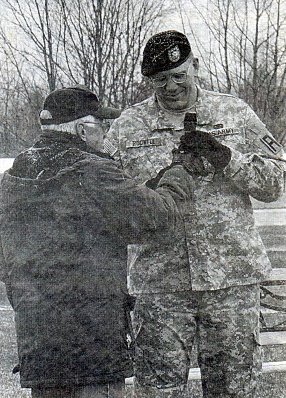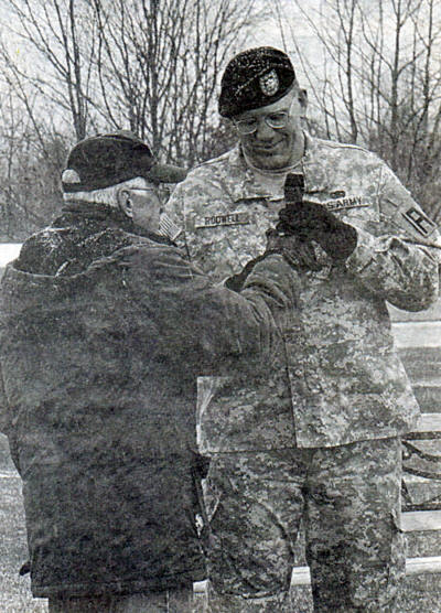 The Highground Volunteer General Manager Kirk Rodman (l) hands the microphone to guest speaker Wisconsin National Guard Senior Advisor Lieutenant Colonel Mark Rodwell during a Veterans Day Celebration held Tuesday, Nov. 11, at The Highground.