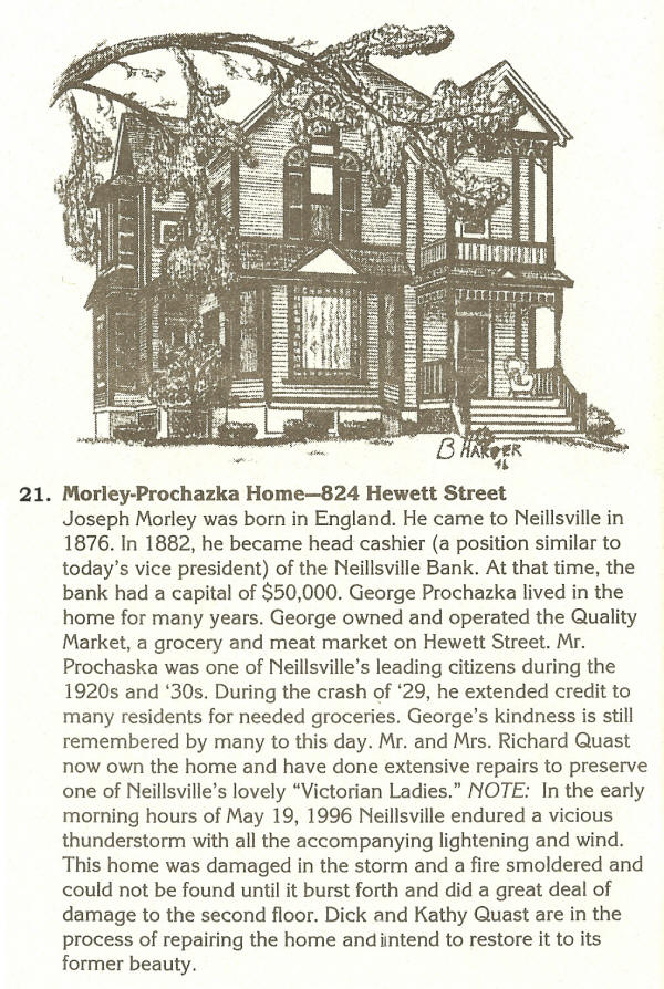 14. Tragsdorf -306 Grand Ave. This home was built late in the nineteenth century in the Italianate style on Grand Avenue -- one of Neillsville’s most desirable neighborhoods of the time. A family by the name of Montgomery built the home. In the 1890s, shortly after the home’s construction, the property was purchased by Bernhardt and Bertha Tragsdorf. Bernhardt, or “Benny”, was one of Neillsville’s prominent businessmen – having been a partner in the general merchandise firms of “Balch & Tragsdorf” and “Tragsdorf, Zimmerman & Company”. The Tragsdorf House was home to the family’s seven children: William, Clara, Elsie, Lillian, Freddie, Walter and Edna. After Bernhardt’s death in 1909, the home remained in Bertha’s hands until her death in 1938. Subsequent owners of the home have included: Otto Zaeske and Glenn Short. The home is currently owned by Pete and Sue Ewing. This home is now owned by Pete Ewing, the plumber. B. Harder Sketch. |