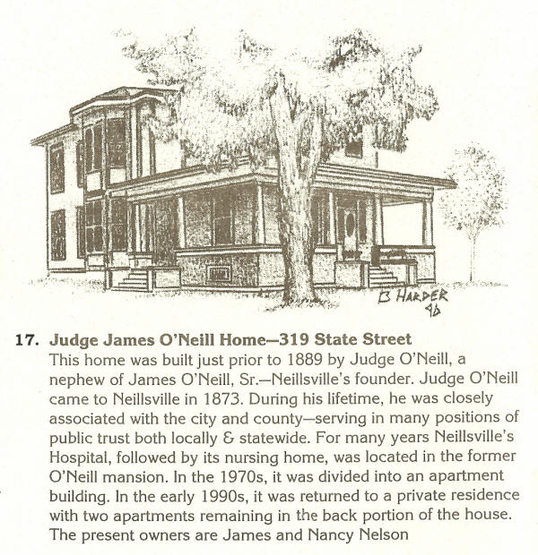 17. Judge James O'Neil House (circa 1876-1880) James O’Neill came to Neillsville in 1873 to visit his uncle. For a time he practiced law alone, then with partners. He was appointed District Attorney for Clark County in 1887 and then elected in 1888. In 1897 James O’Neill was elected to the bench of the Seventeenth Circuit Court where he served until 1922. The O’Neill house was originally constructed in the Italianate style but has incurred modifications. The structure served as the community’s hospital from 1931-1954, then a nursing home until 1963. The structure has since returned to a private residence and has had its Victorian characteristics restored. Address is 319 State Street. B. Harder Sketch. |
