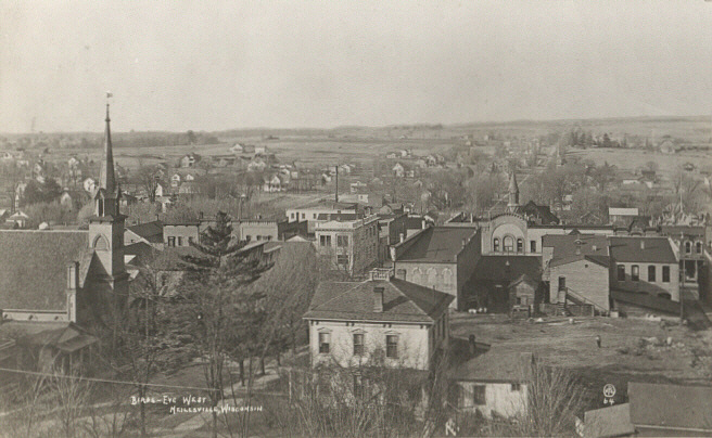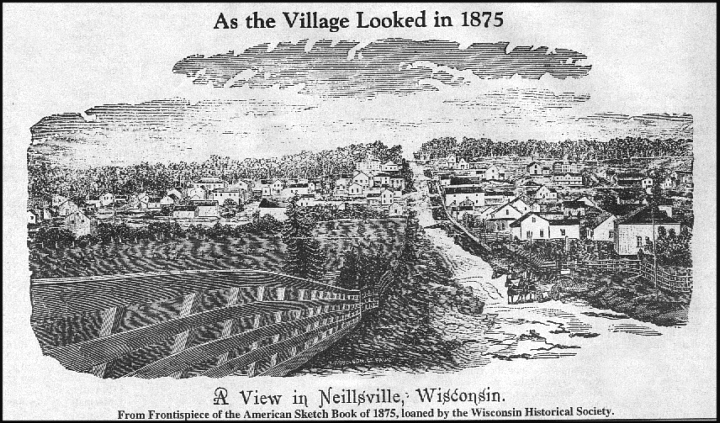 45 1875-from the crest of the hill on the Humbird-Neillsville Rd (now 5th St.) The James Hewett Home, not pictured, would have been on the left, behind the wooden fence. St. John's Lutheran School and Church is now located. |