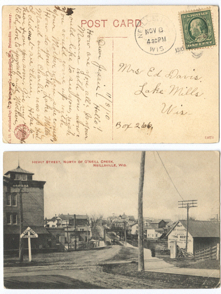 Neillsville State Bank Opening, Neillsville Waterworks (1909), Hewit/Hewitt St., Neillsville, WI 8 NOV 1910, Neillsville--Water Works & Grand Ave. Bridge (circa 1915), Mouth of O'Neill Creek (1911),