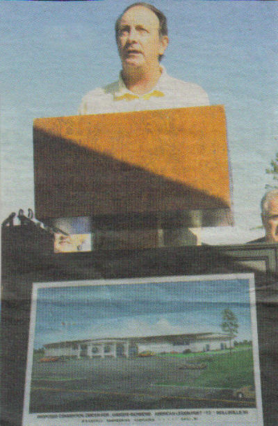 The Listeman Foundation?s Ben Urlaub invoked the name of Harold Naedler whose generous legacy would go a long way toward the new Legion Hall (pictured on the front of the podium stand) becoming a reality. |