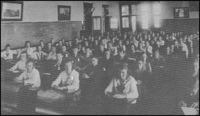 The left half of the Main Room is shown in this photo. 1. E. J. McKean who was principle at that time. 2. Sally (Olson) Schwarze. 3. Robert Olson. 4. Kenneth Ruddock (the 6'4 basketball center). 5. Barbara (Olson) Daniel. Photo provided by Ken Olson. |